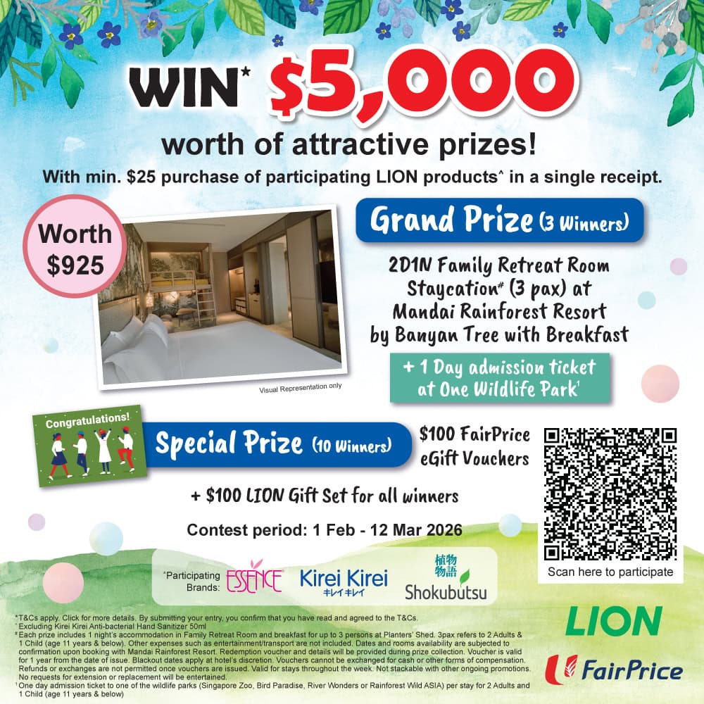 Grand Prize (3 winners): 2D1N Family Retreat Room Staycation (3 pax) at Mandai Rainforest Resort by Banyan Tree with Breakfast and 1 Day admission Ticket at One Wildlife Park (worth $925) + $100 LION Gift Set