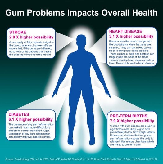 Research shows gum problems not only affects your oral health but also increases risk of other health conditions. This mouth-body connection is the result of harmful bacteria triggering off health ailments in other parts of the body.